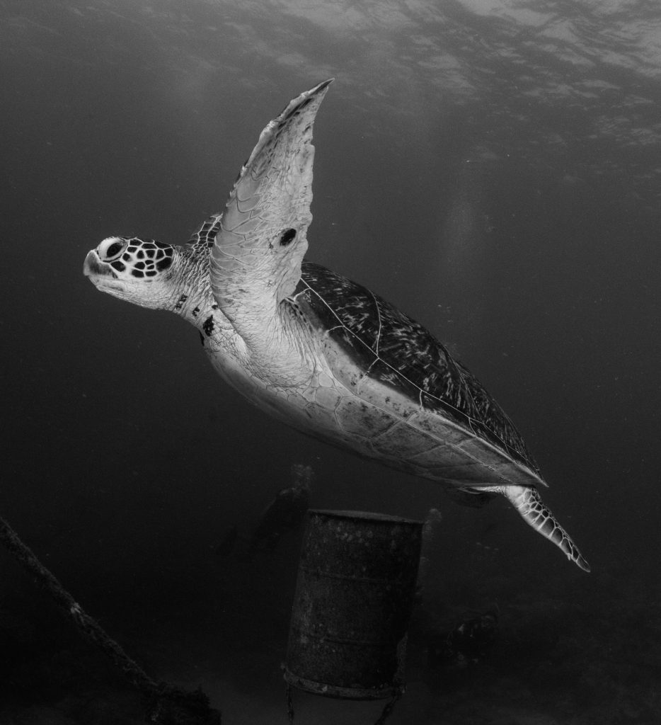 E de repente, um torpedo. Sentimos a deslocação da água perto das nossas cabeças e o nosso cabelo move-se a esse ritmo. Nem temos tempo de compreender o que aconteceu. “O que era?” Foi demasiado rápido, mas agora estamos atentos. Vemos um grupo de bonitos (uma espécie de atum) pretos. Uma cor nada normal nos bonitos. Viemos a saber que durante a altura de lua cheia, eles tornam-se pretos para se camuflarem melhor dentro de água, para que a luz da lua não os denuncie. Normalmente são cinzentos e têm um aspeto lustroso, que iria certamente refletir a luminosidade da lua.
