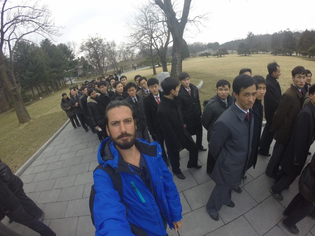 15 – No Mausoléu, onde os dois Líderes falecidos descansam em paz, tivemos que passar por uma série de medidas de segurança relacionadas com a nossa limpeza e segurança do edifício. Tivemos que colocar as nossas melhores roupas (que nos disseram para levar, por e-mail antecipadamente), andar em linha, tranquilos, sem rir ou sorrir e fotos não foram permitidas no interior. Passeamos por um número interminável de quartos e por corredores (ao estilo de Las Vegas) cheios de fotos dos Líderes a praticar o bem para o seu povo, fronteiras com check-ups, até chegarmos à sala onde eles estavam acomodados dentro de um caixão de vidro. A majestosidade deste lugar é indescritível! Pisos de mármore, pilares de ouro, entre outros pormenores riquíssimos. Aqui vimos grupos de homens e mulheres bem vestidos visitando os Líderes (era um domingo), mas debaixo das suas roupas conseguíamos ver as suas roupas de trabalho normais e a pele queimada pelo sol. Além disso, vimos a mesma mulher noutra atração turística.