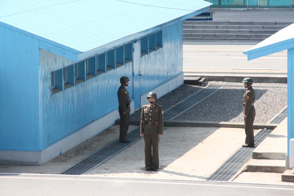 10 – No Paralelo 38, a linha que separa os dois países é um pequeno rodapé, com 20cm por 10 de altura, com pequenos barracões azuis onde eles podem se encontrar e discutir assuntos de paz (ou não). Segundo nos mostram na televisão, imaginamos que os edifícios estão a alguns quilômetros de distância… não, eles estão no máximo a 100 metros de distância e no lado norte, podemos ver grandes binóculos voltados para o sul. E no sul? Nada nem ninguém.